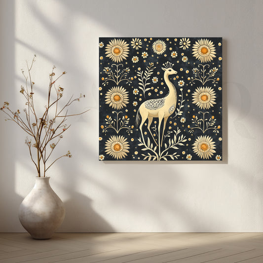This Black Folk Deer with Golden Blossoms canvas features a stylised cream deer framed by...