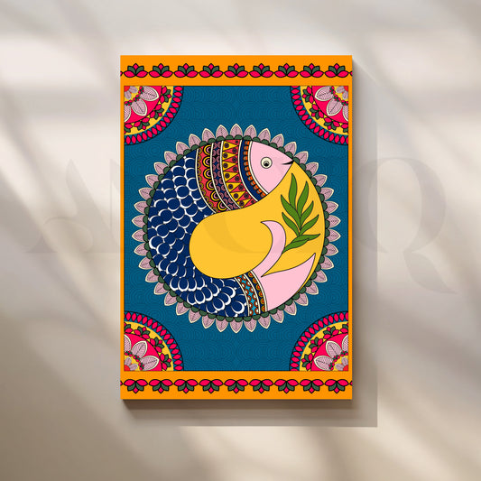 This Madhubani Fish Harmony folk art canvas showcases intricately patterned fish and lotus motifs in...