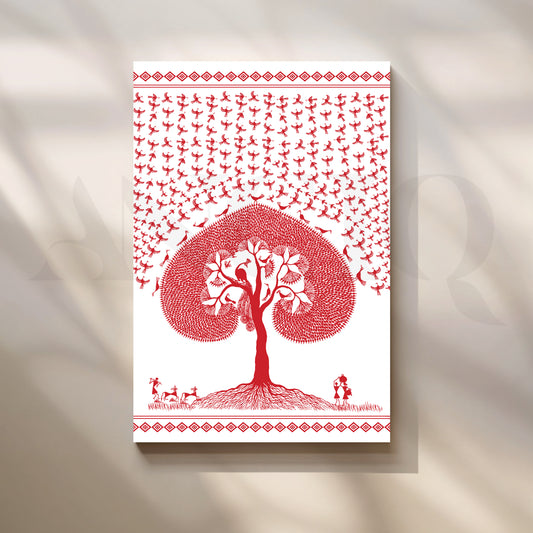 This Red Warli Tree of Life canvas painting features tribal dancers, birds and a sacred...