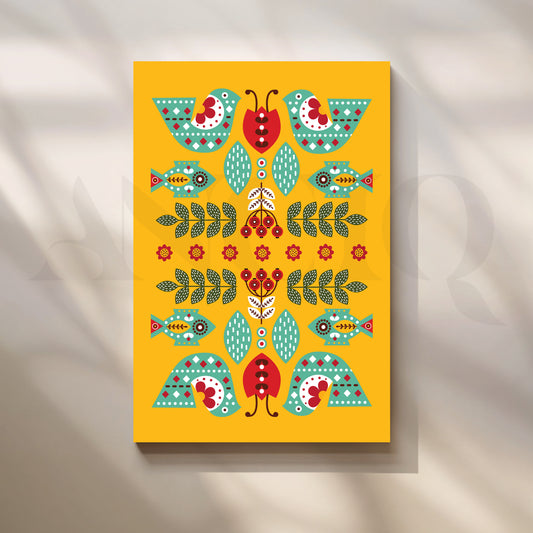 Folk Birds & Fishes Yellow Canvas Wall Art features playful birds, fishes and leaf motifs...