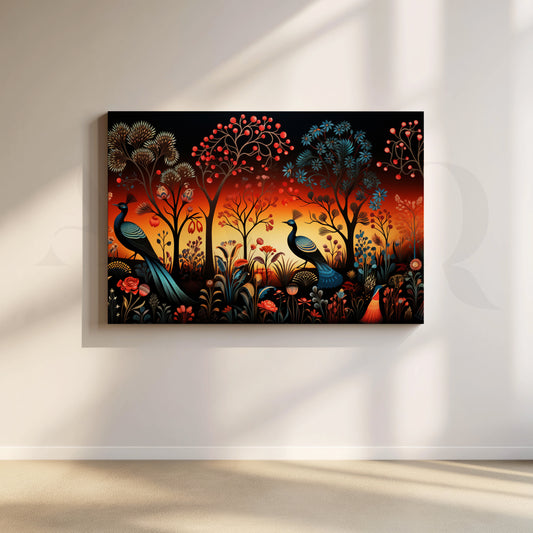 This striking canvas captures peacocks amidst a glowing sunset forest, rich with flowers and tall...