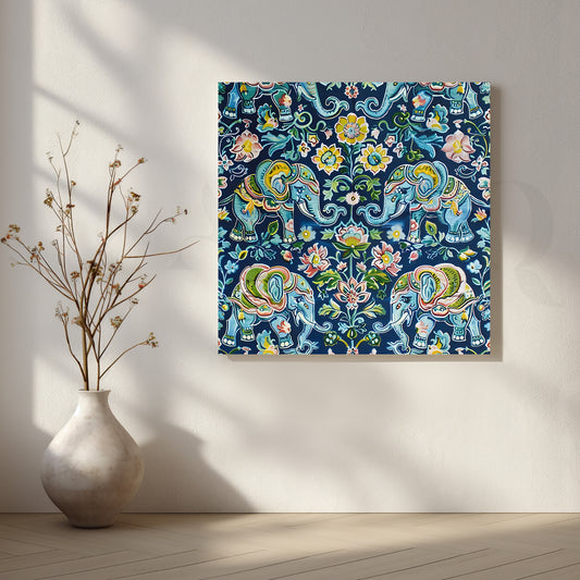 A majestic Anciq artwork depicting decorated elephants with floral motifs on a deep blue background—symbolizing...