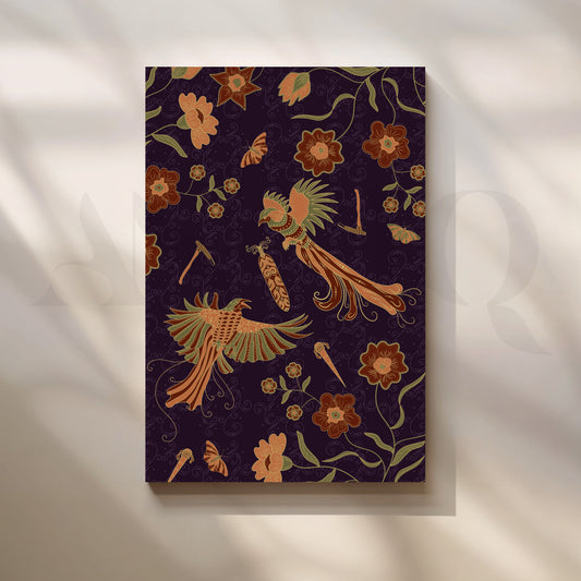 A cheerful Anciq artwork blending tropical florals and playful birds in warm tones—perfect for bedrooms...