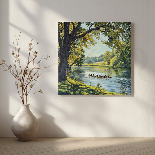 Anciq ‘River Parade’ Canvas Artwork for Dining Room captures a tranquil scene of boats gliding...