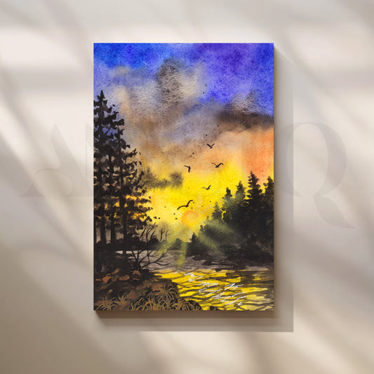 Anciq ‘Twilight Birds Over Forest Creek’ Canvas Artwork blends golden light, silhouetted trees, and birds...