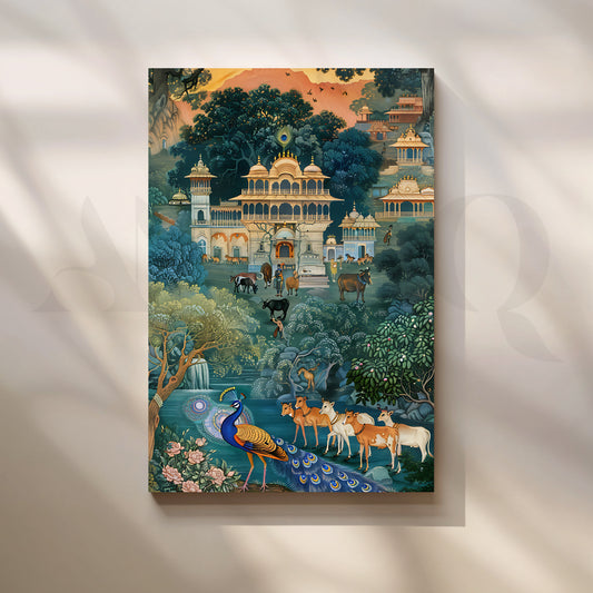 Anciq ‘Royal Monsoon in Gokul’ Canvas Artwork features intricate Rajasthani palace scenes with cows, peacocks,...