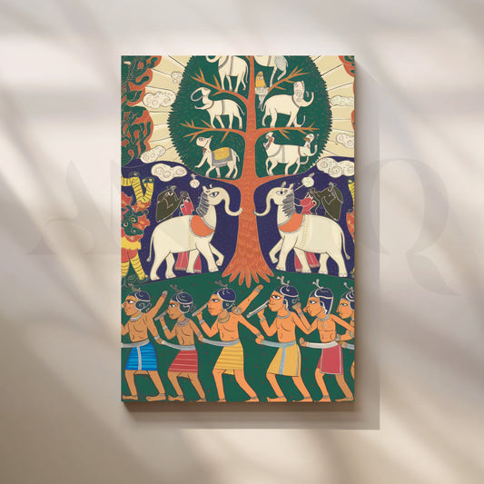 Anciq ‘Divine Procession Under Kalpavriksha’ Canvas Artwork captures a mythological Indian tree of life with...
