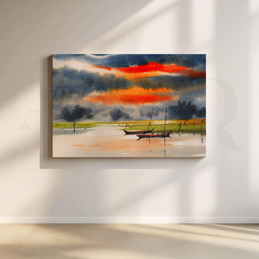 Anciq ‘Sunset Stillness with Boats’ Canvas Artwork evokes calm with its orange-tinged skies, moored boats,...