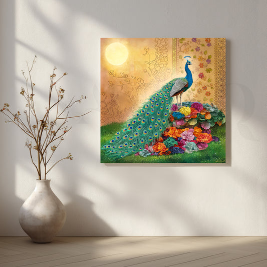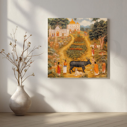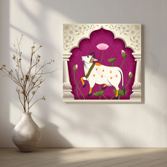 A curated range inspired by Nathdwara’s Pichwai tradition—lotus blooms, cows, peacocks, and festive motifs—created by licensed, credited artists and made-to-order in India.