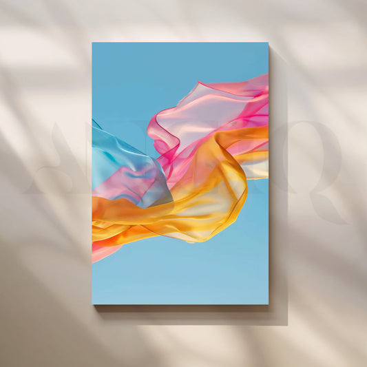 Breezy ribbons of translucent fabric drift across a clear blue sky in pink, gold, and...
