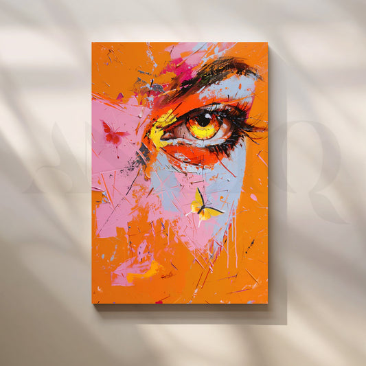 A striking close-up eye emerges from vibrant orange, blush pink, and electric blue, with fine...