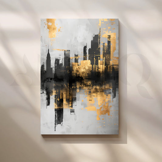 Bold charcoal tones meet luxe metallic gold in “Gilded Skyline,” a striking cityscape abstract that...