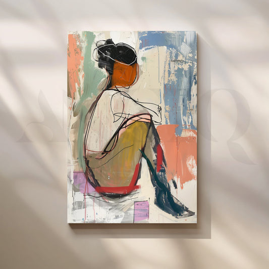 “Seated Muse” is a contemporary figurative canvas rendered in expressive line art and palette-knife texture....