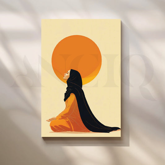 “Sunlit Serenity” captures a peaceful moment of a woman in a flowing black hijab seated...