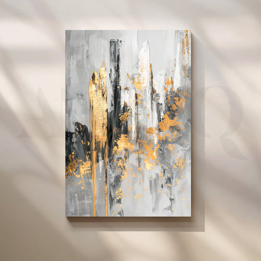 A luxe abstract canvas in layered greys and charcoal is struck with bold metallic gold...
