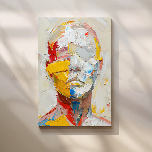 “Chromatic Visage” fuses bold palette-knife texture with electric reds, yellows, sky blues, and creams to...