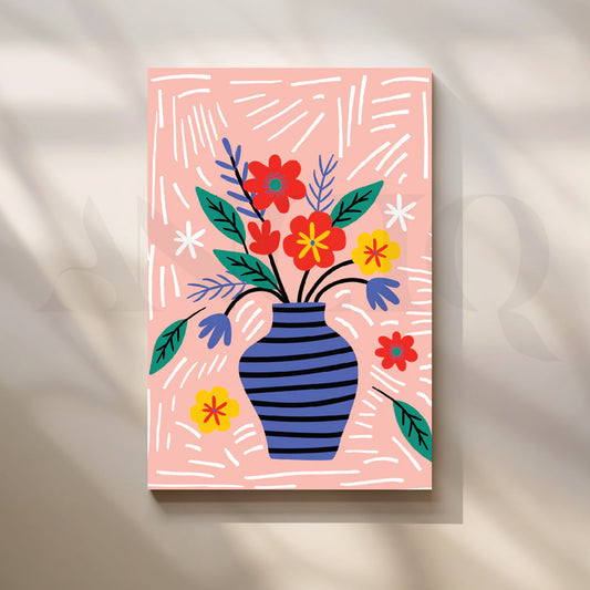 Brighten your home with this cheerful floral canvas painting featuring a bold blue striped vase,...