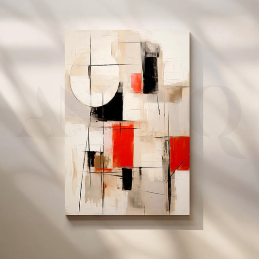Bold and balanced, “Crimson Geometry” is an abstract canvas painting in cream, black, and vivid...