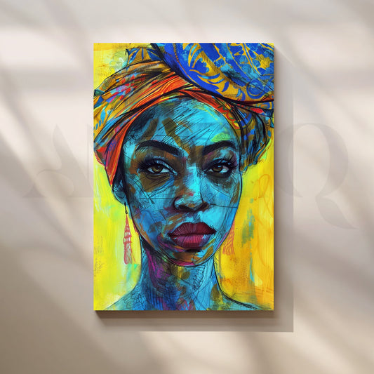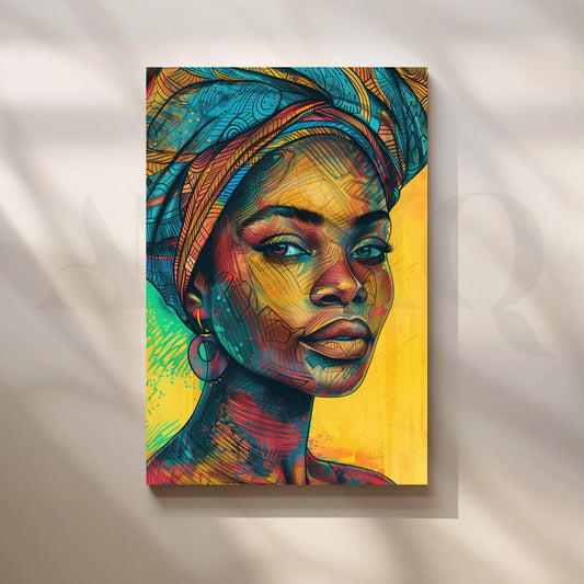 Sophisticated and radiant, “Golden Gele Profile” features a side-profile portrait in ochre, turmeric, and jewel-tone...
