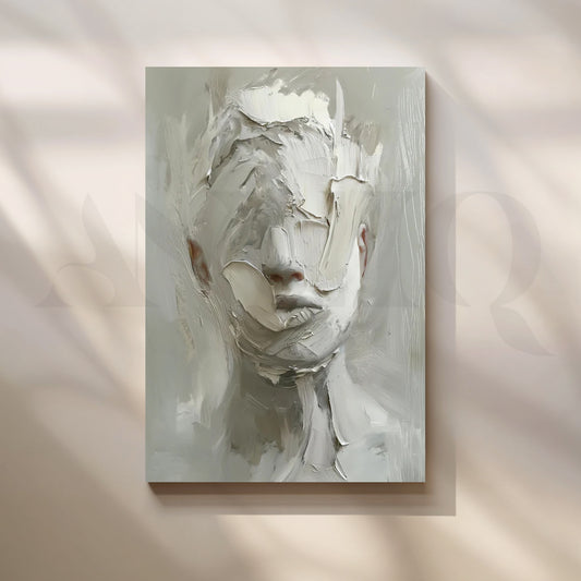 Soft sculptural swaths of layered whites and greys give “Ivory Muse” its serene, tactile presence....