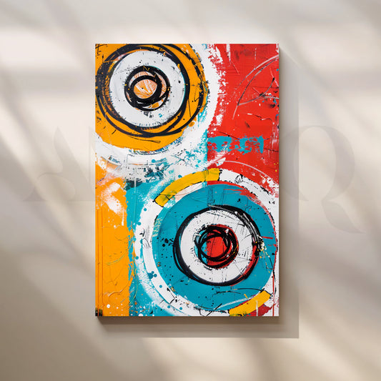 Vibrant rings of teal, tangerine, red, and sun-yellow collide in “Kinetic Orbits,” a playful abstract...