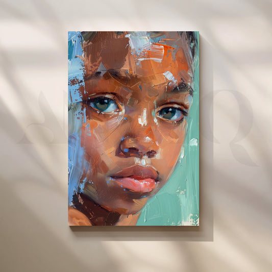 Soft, impasto portrait of a child with luminous sea-glass blue eyes and soothing teal background—gentle...