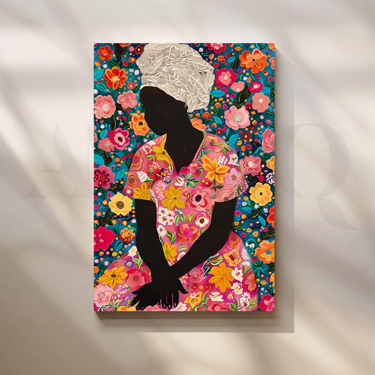 A graceful female silhouette rests against a lush field of pink, teal, and coral blooms,...