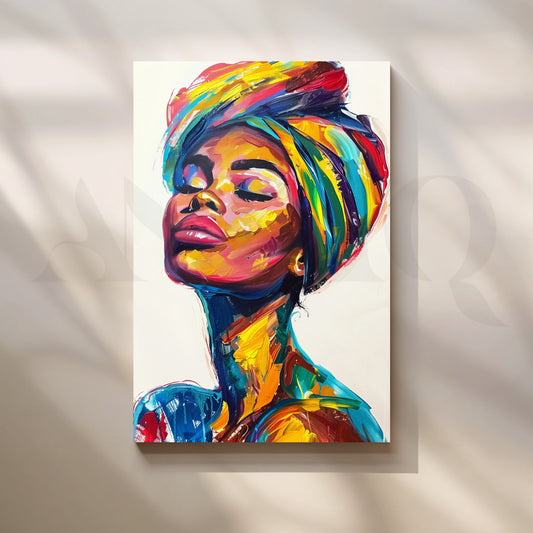 Vibrant, impasto-style portrait canvas showcasing a woman in a multicolor headwrap against crisp white—rich strokes...