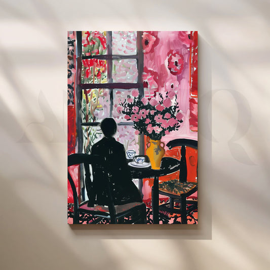 Lush figurative scene of a quiet breakfast table by a flowering window, painted in expressive...