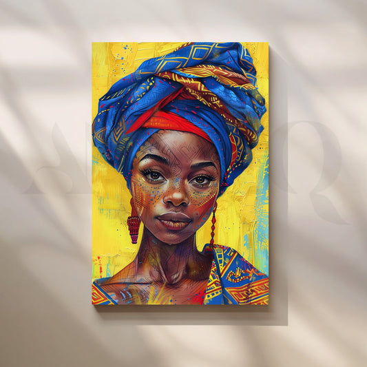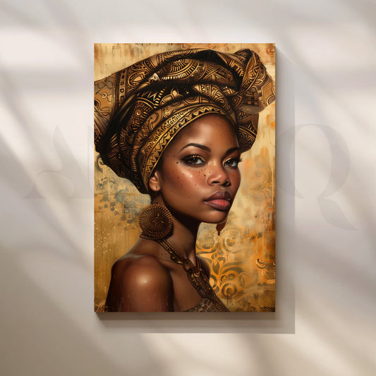 Radiant portrait canvas featuring a regal woman in an ornate golden headwrap on a warm,...
