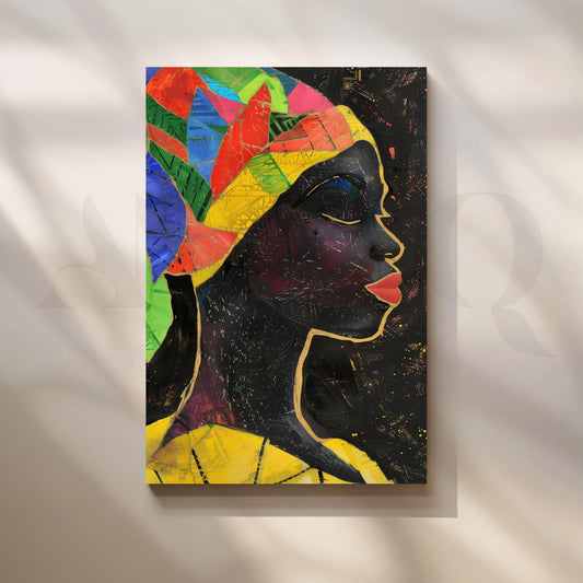 Graphic side-profile portrait with a geometric, multicolor headwrap set against a dramatic black ground—bold modern...