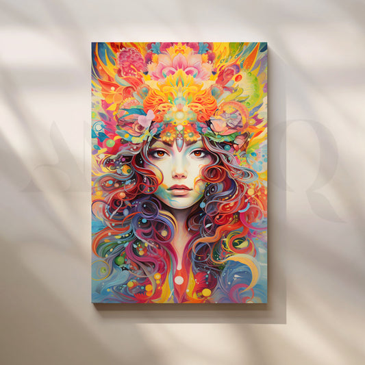 Hypnotic, color-drenched portrait of a serene woman crowned with a radiant floral headdress—swirling rainbow hair,...