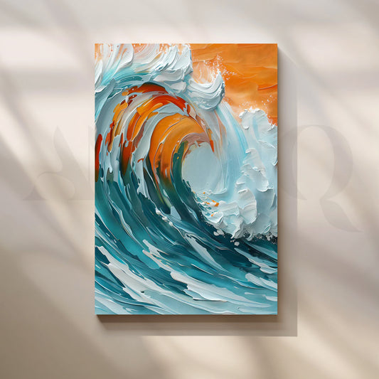 Dynamic impasto wave curling under a warm amber sky—teal, aqua and foamy whites sweep across...