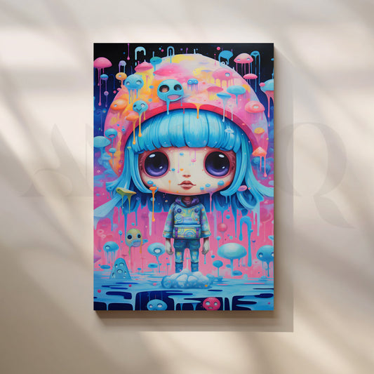 Kawaii pop-surreal portrait of a blue-haired, big-eyed girl wearing a candy-pink mushroom hat, surrounded by...