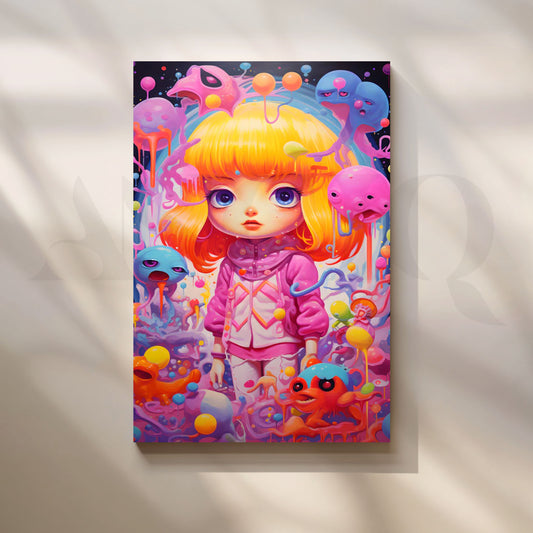 A vibrant pop-surreal portrait of a big-eyed blonde girl in a pink hoodie surrounded by...