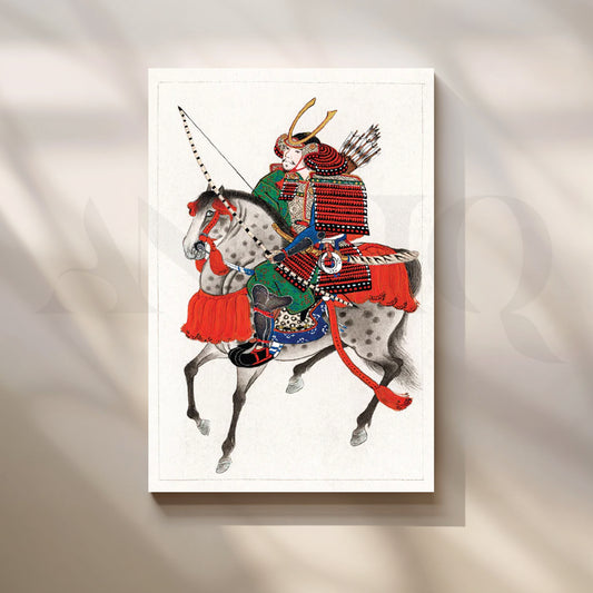 Honor timeless valor with this Japanese samurai wall art featuring a mounted warrior in vermilion...
