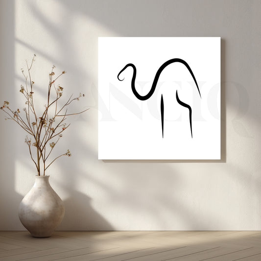 A clean, minimalist canvas featuring a black line drawing of a camel against a crisp...