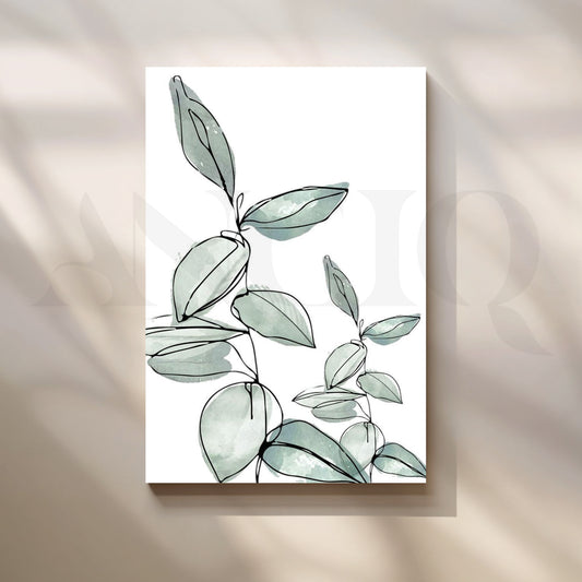 Anciq ‘Botanical Flow’ Canvas Painting captures graceful green leaves outlined in black against a white...