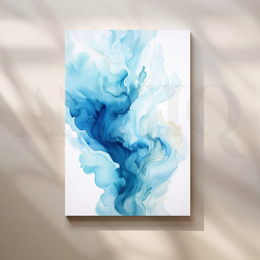 An abstract canvas depicting fluid blue and white waves in a soothing watercolor style. This...