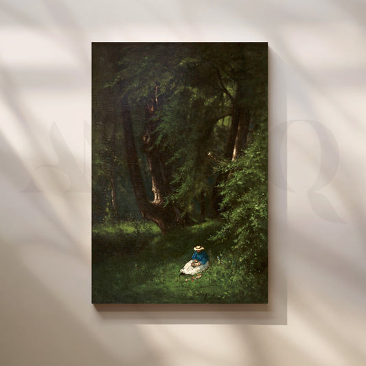 This atmospheric canvas artwork captures a lone lady seated in a sunlit clearing surrounded by...