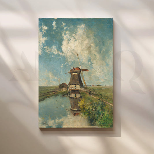 This detailed canvas artwork features a traditional windmill reflected in a calm canal under a...