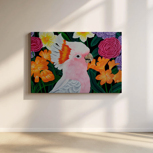 A garden in full bloom with the charming subject - Major Mitchell’s Cockatoo creates a...