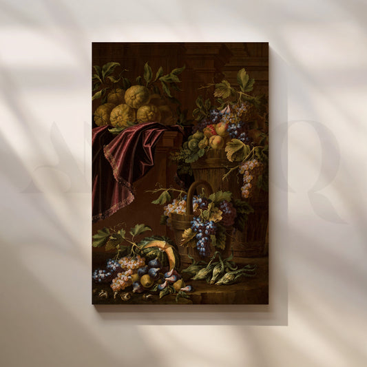 A grand Anciq artwork displaying lush baskets of grapes, plums, and melons draped in rich...