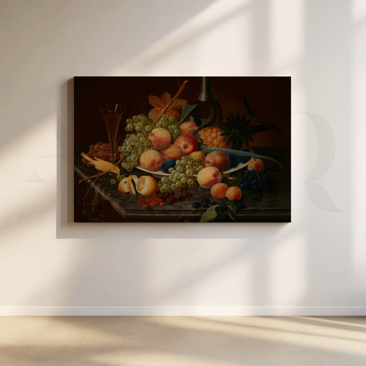A rich still-life Anciq artwork featuring peaches, grapes, oranges, and berries arranged on a rustic...