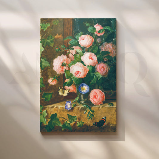This serene Anciq artwork captures a bouquet of soft pink roses surrounded by fluttering butterflies...