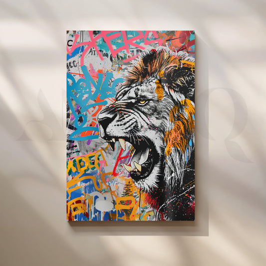 Electrify your space with a roaring lion framed by bold graffiti tags and paint splatters—an...