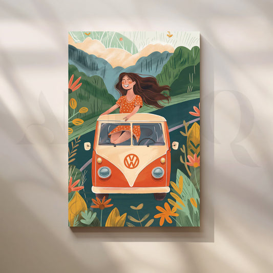 Whimsical travel scene of a joyful girl in a retro van cruising through lush, floral...