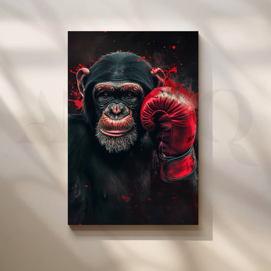 Explosive red splashes frame a fierce chimp with a glossy boxing glove, fusing pop-art punch...
