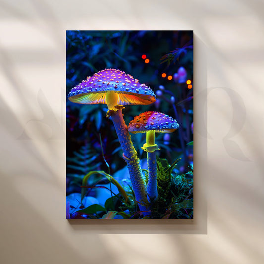 Immerse your space in dreamy, bioluminescent color with this vibrant mushroom canvas—electric blues, violets, and...