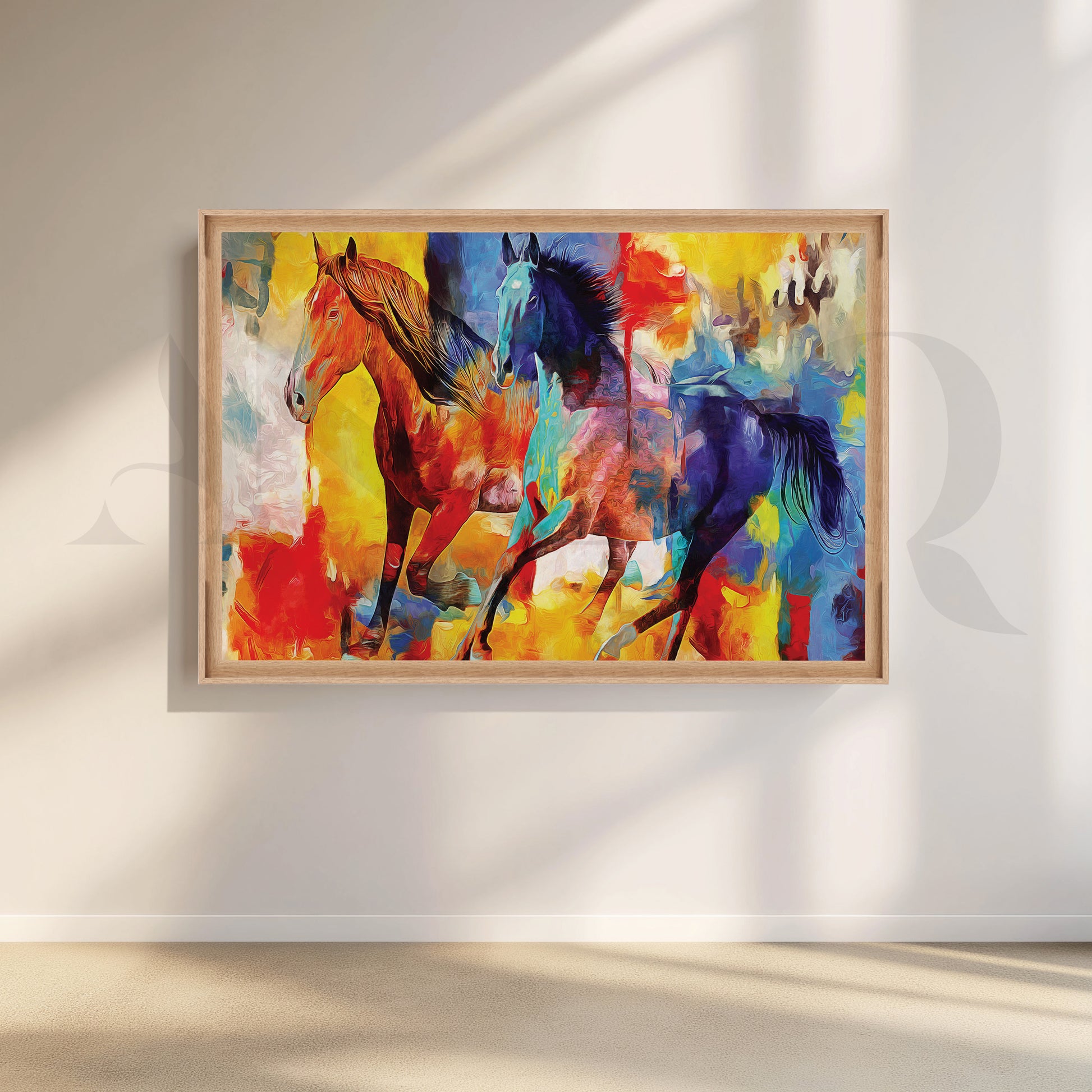 Bring the wild beauty home! This canvas painting shows horses running free depicting the symbol of freedom and strength. Their fur is colorful and their hair flies in the wind. It's a lively piece that looks great on any wall. It is a great pick to add to your home/office decor.